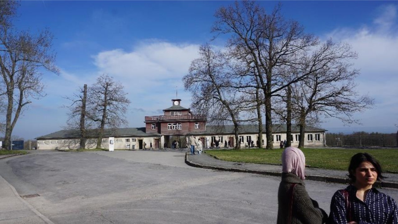 Nach dem gemeinsamen Frühstück sind wir von der Jugendherberge von einem Reisebus abgeholt worden und zum Ettersberg gefahren. Dort befindet sich das sog. Hauptlager mit dem markanten Eingangstor des KZ Buchenwald-Dora Komplexes. Die Bushaltestelle auf dem Ettersberg ist inmitten einer ehemaligen SS-Kasernen Anlage, die dem Lager zugehörig war. Die unzähligen Gebäude machten sehr deutlich welche Ausmaße dieses Lager hatte. In einem der Gebäude befindet sich heute das Besucherzentrum mit dem pädagogischen Dienst, einem sehr gut sortierten Buchladen und einem Restaurant/ Cafe.